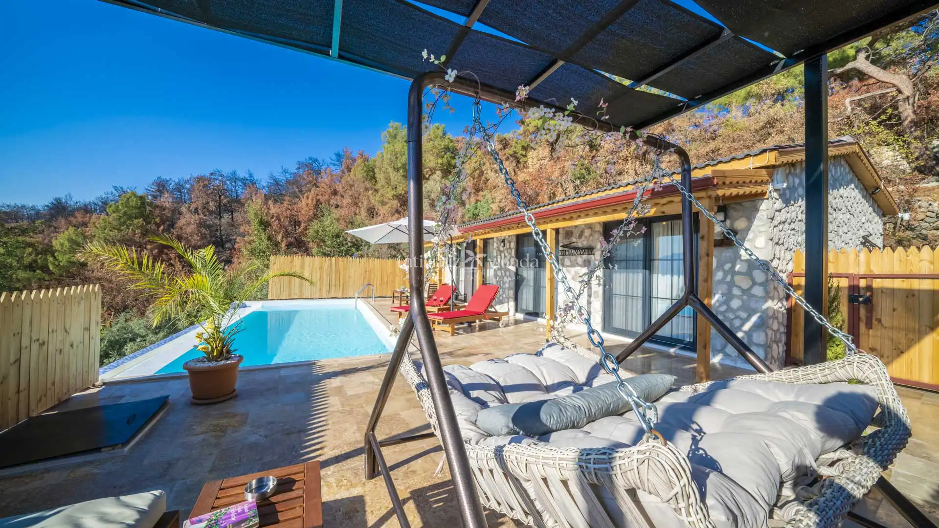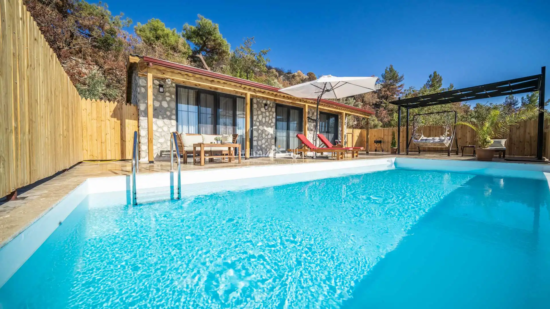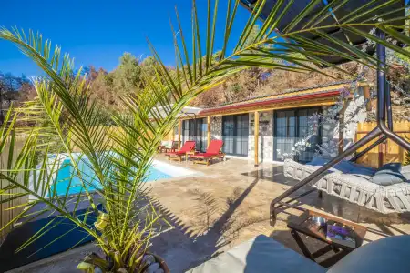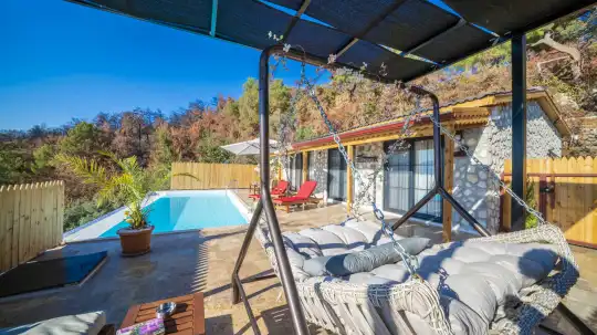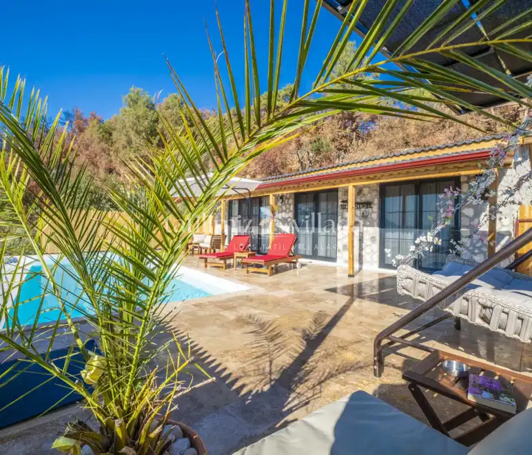 Özel yüzme havuzu ve bahçe alanı dışarıdan görünmeyecek şekilde korunaklı olarak tasarlanmıştır. Bu özelliği sayesinde mahremiyete önem veren misafirler için güvenli ve rahat bir tatil imkânı sağlar. Özellikle Kalkan kiralık villa, Kalkan balayı villası ve muhafazakar kiralık villa arayışında olan çiftler için öne çıkan alternatifler arasında yer almaktadır.