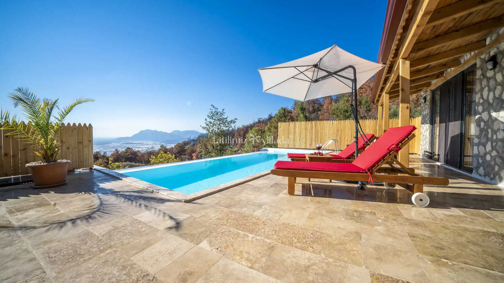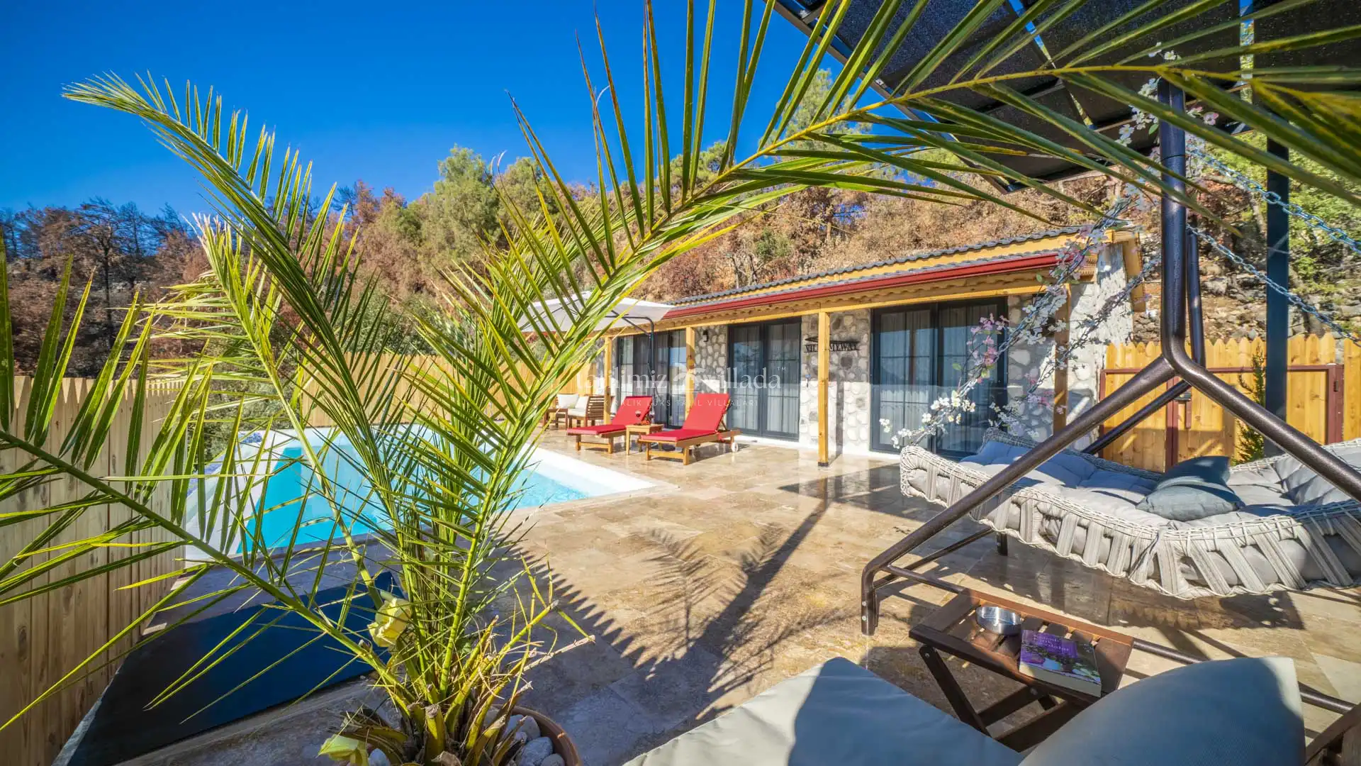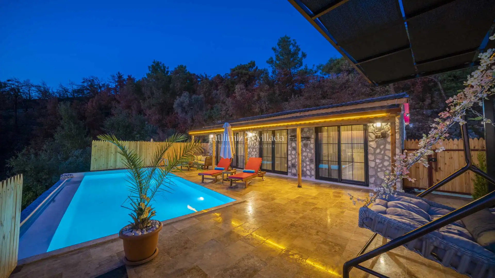 Özel yüzme havuzu ve bahçe alanı dışarıdan görünmeyecek şekilde korunaklı olarak tasarlanmıştır. Bu özelliği sayesinde mahremiyete önem veren misafirler için güvenli ve rahat bir tatil imkânı sağlar. Özellikle Kalkan kiralık villa, Kalkan balayı villası ve muhafazakar kiralık villa arayışında olan çiftler için öne çıkan alternatifler arasında yer almaktadır.